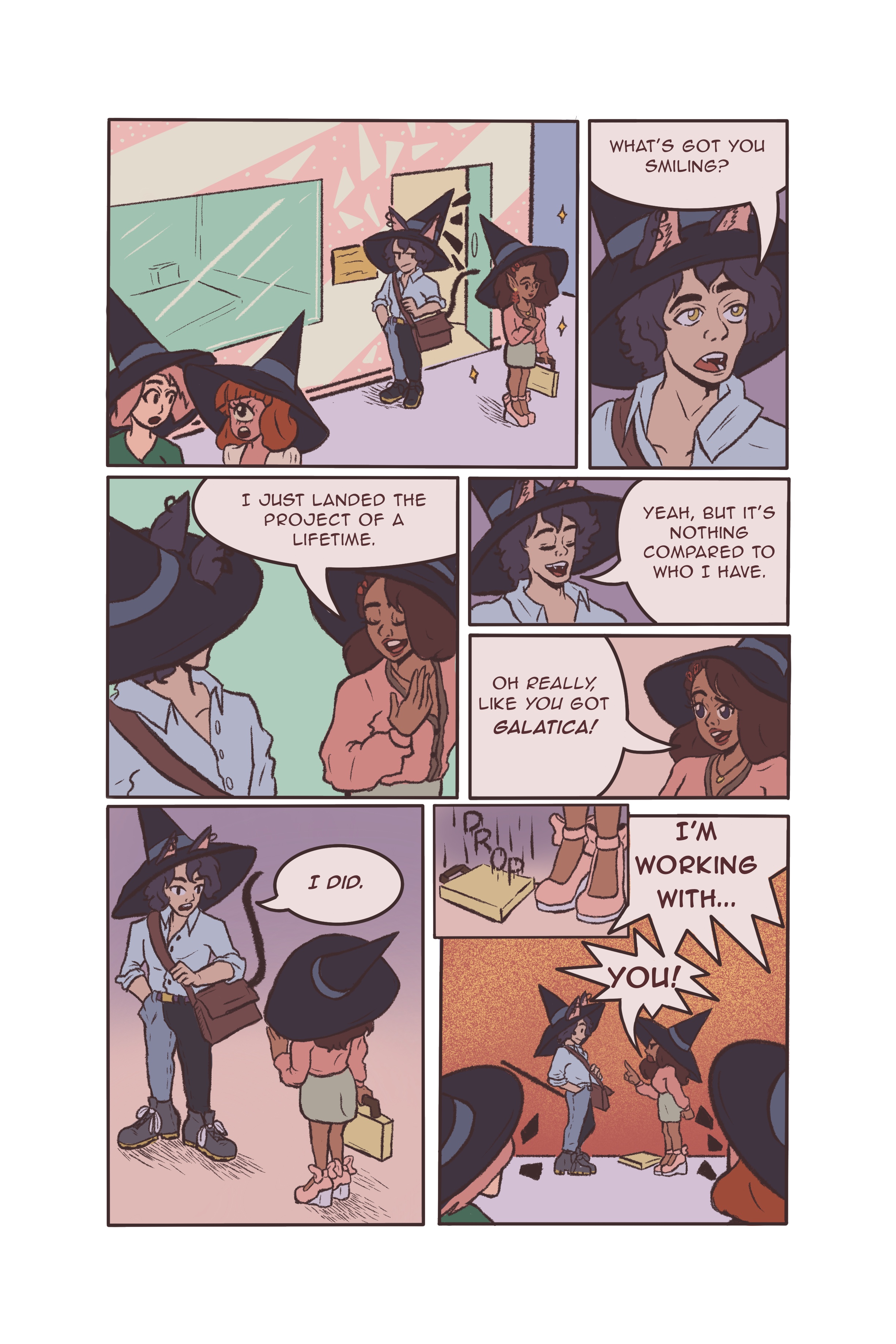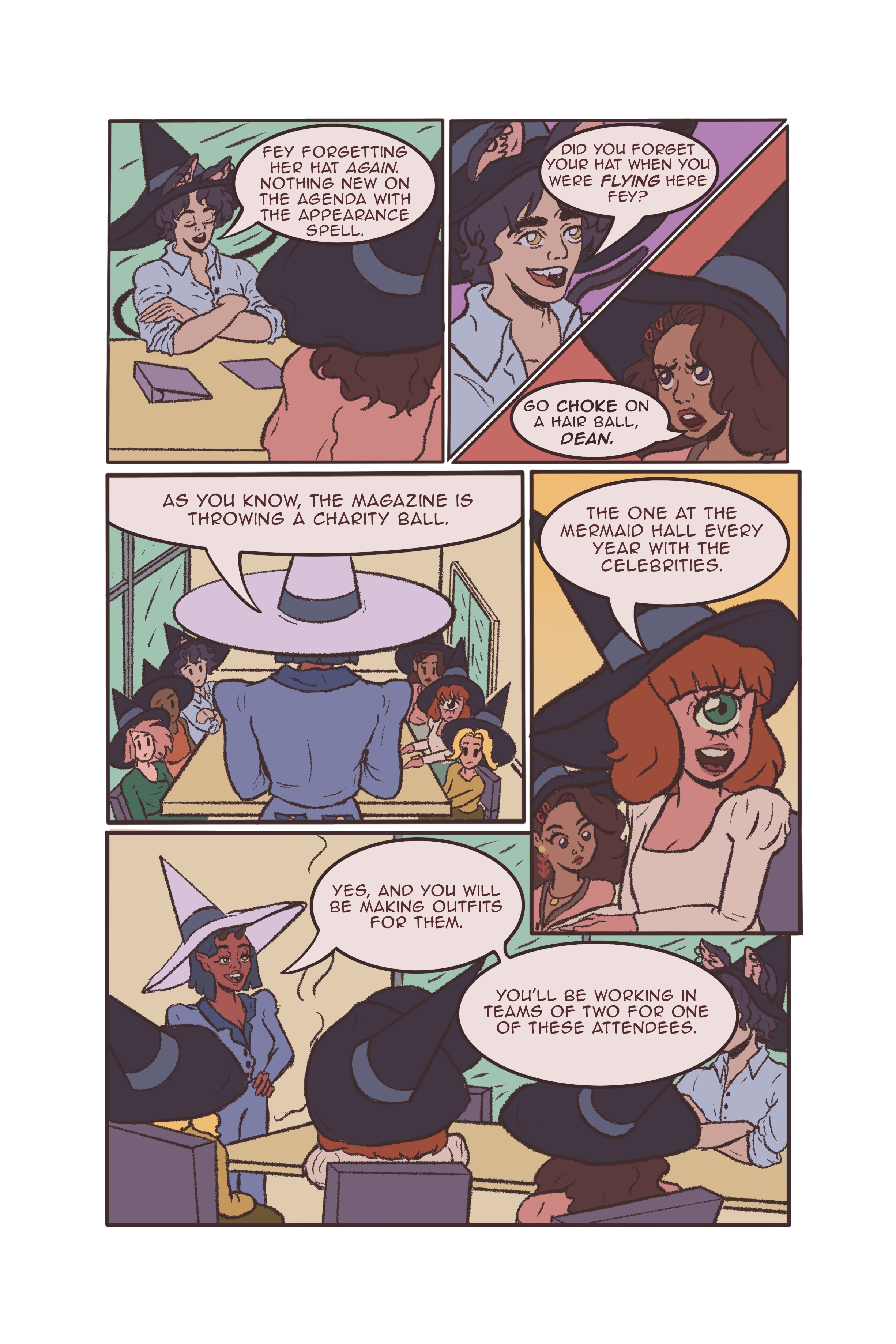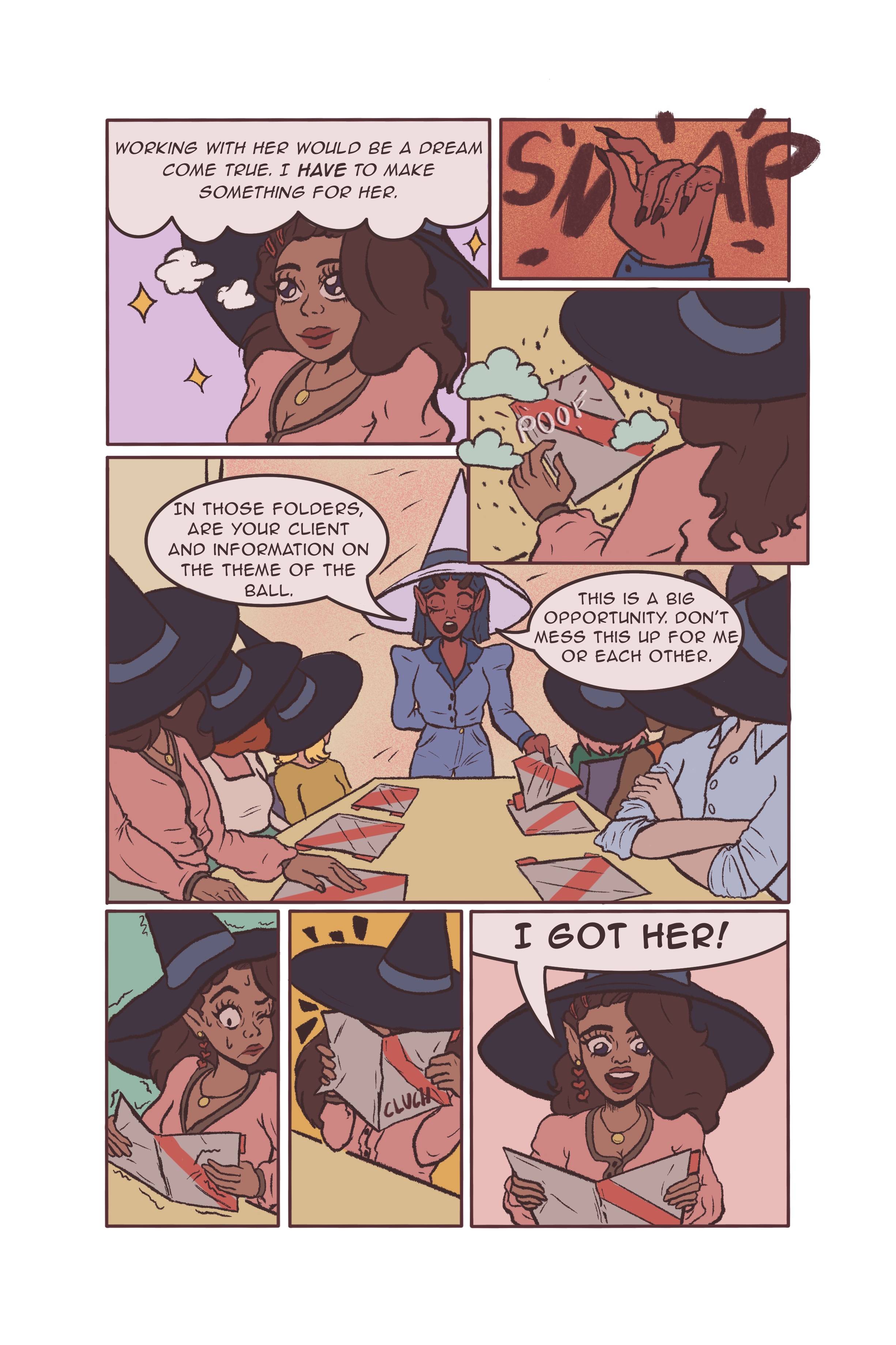 This is a 6 page comic set in a modern day fantasy New York fashion office. My main character, Fey, has been tasked in a big project, but is put together with her rival, Dean.